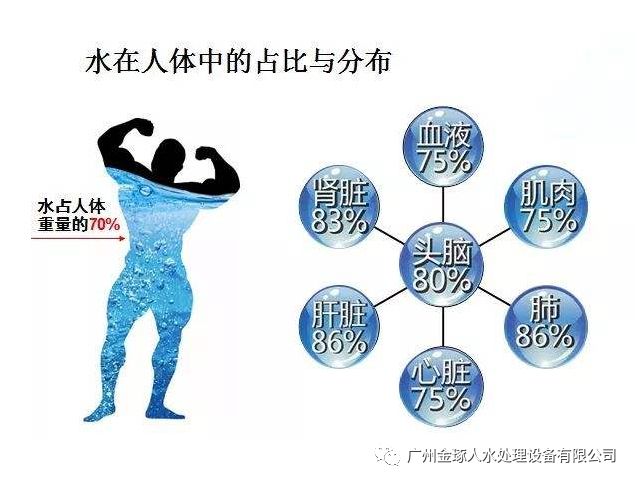 水在人体内的含量达70%,其余30%左右为固体营养物(蛋 白质、碳水化合物、脂质、矿物质、维生素等)。人体60%水在细胞内,40%在流体内(血、消化液、唾液、胆液、泪水、汗液、肠液、胃液)。成年人每天需水2.5 -3升,其中直接饮用1升左右,食物中补充1升,人体新陈代谢形成0.5升。明代李时珍在本草纲目中著到:“药补不如食补,食补不如补”,水不愧为百药之王。